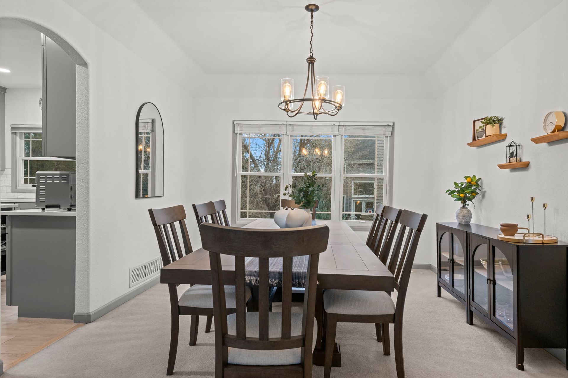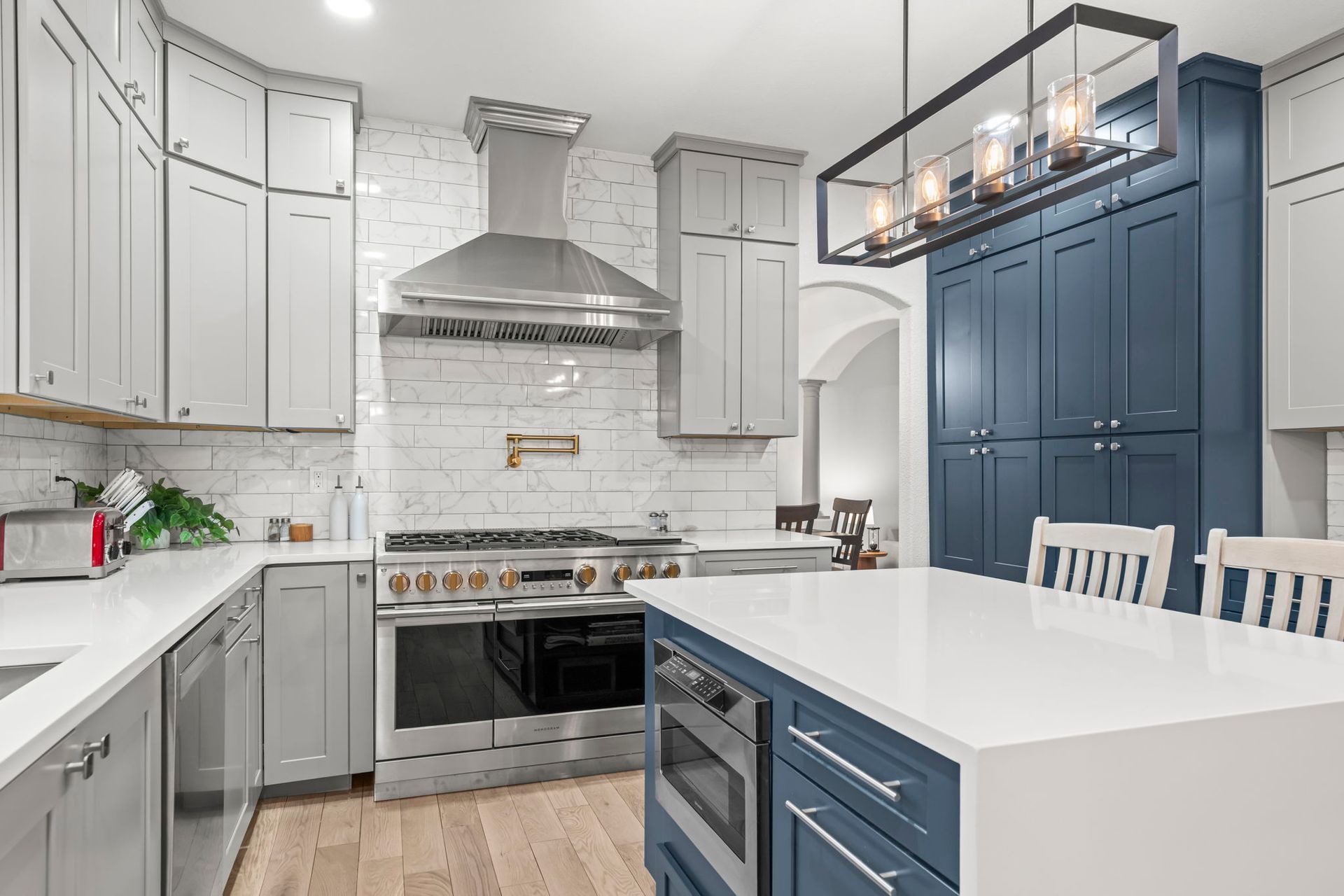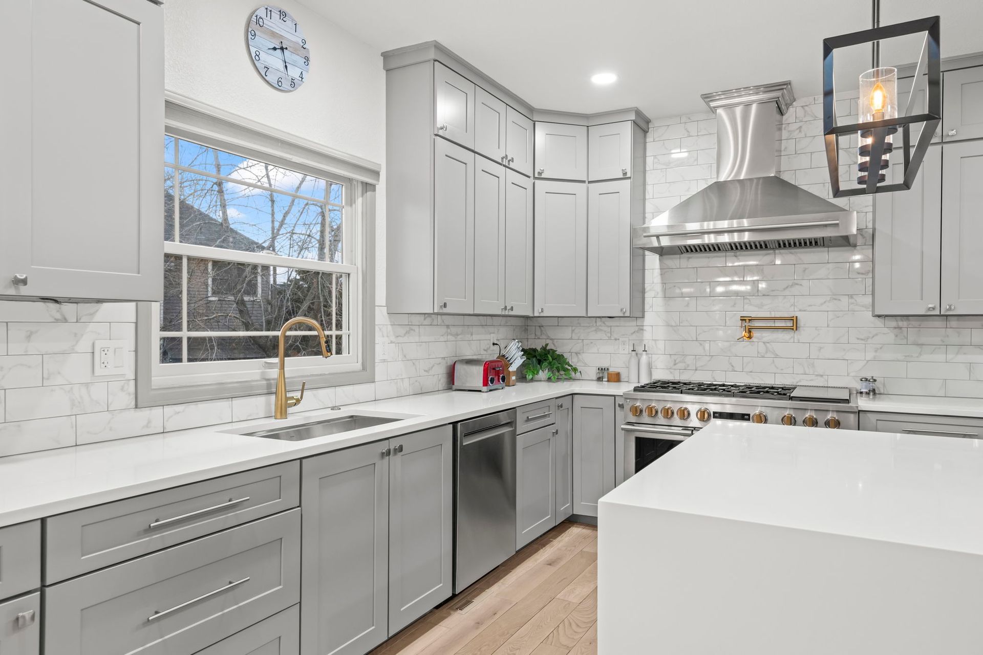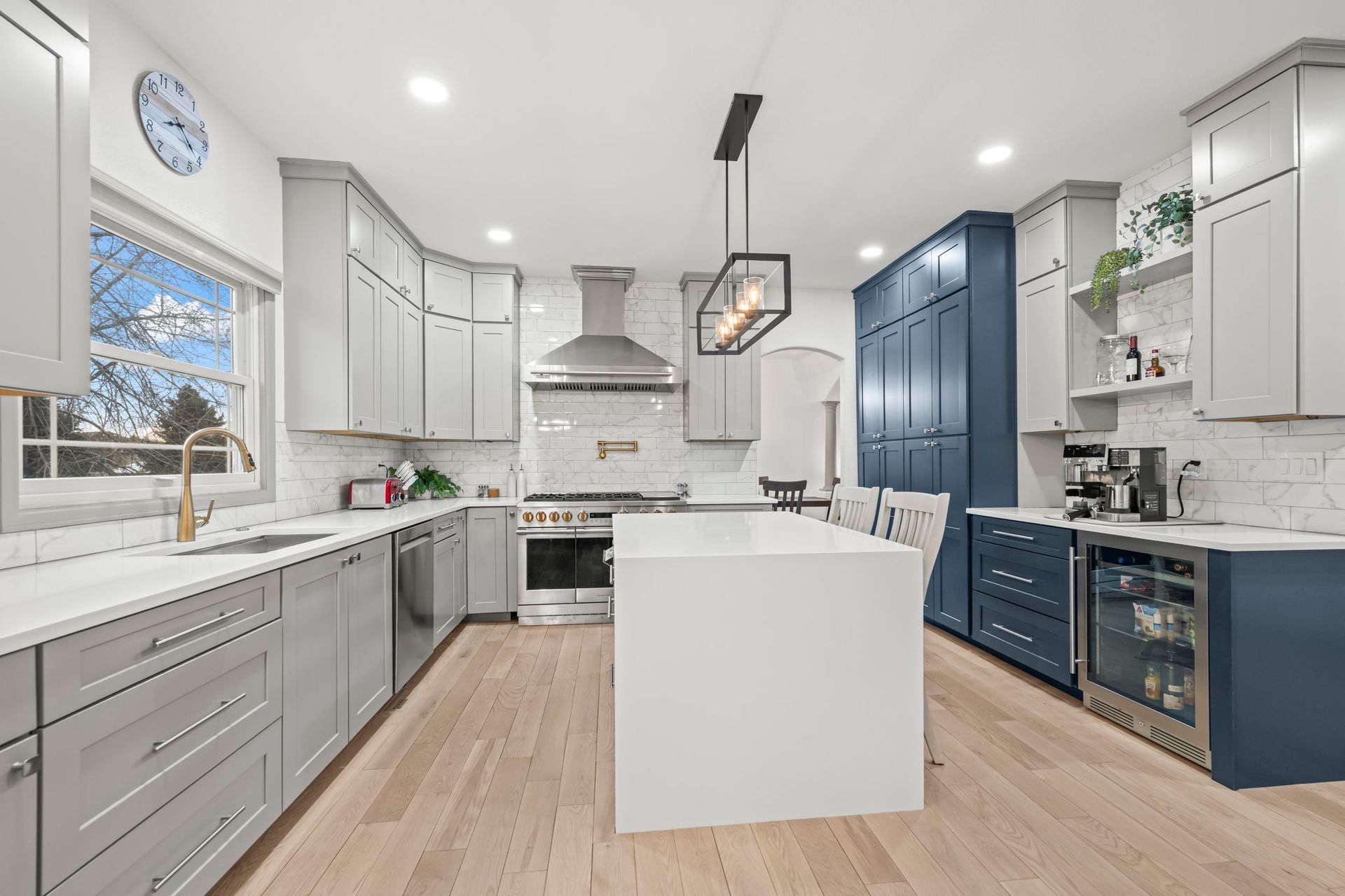 A stunning high-end kitchen renovation is the heart of the home and one of many recent updates, including new carpet, paint, flooring, windows, updated bathrooms, lighting & more. As you step inside discover soaring ceilings, a newly remodeled staircase and extensive white oak flooring on the main-level. The chef's kitchen is a true standout, featuring custom cabinetry, quartz counters, stylish backsplash, large center island w/ a waterfall counter and built-in shelving, beverage fridge, high-end stainless appliances and 6-burner gas stove with hood.