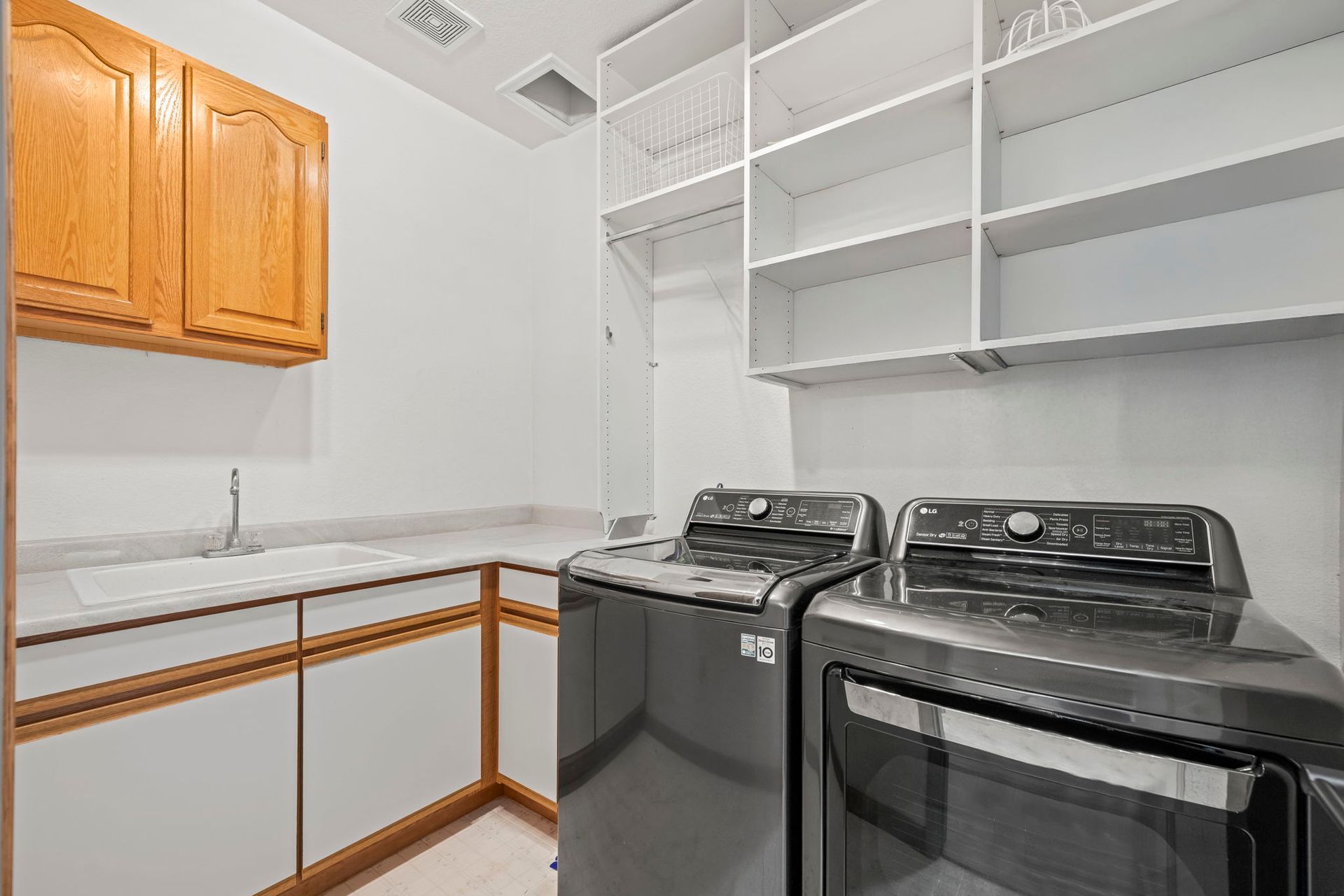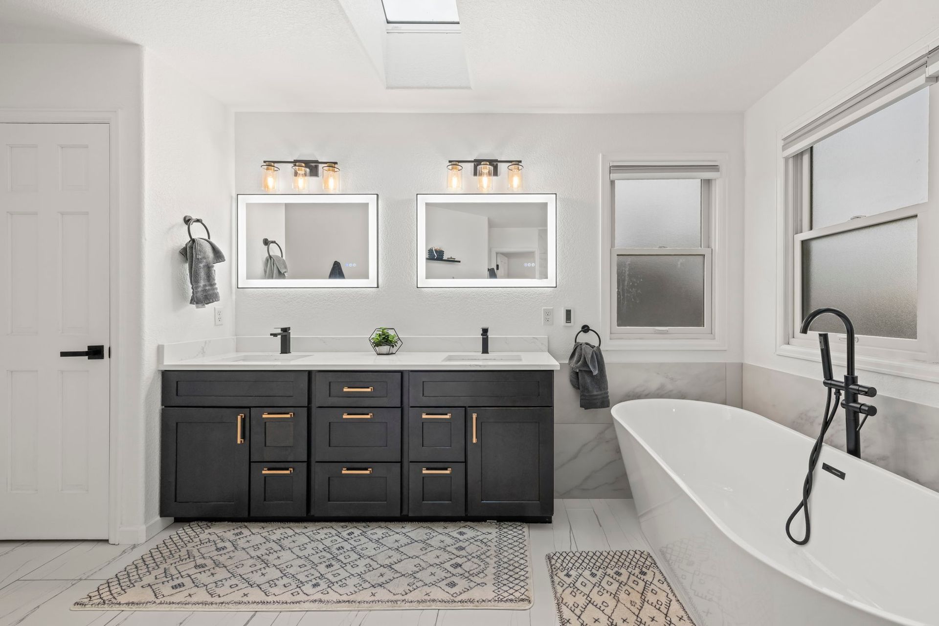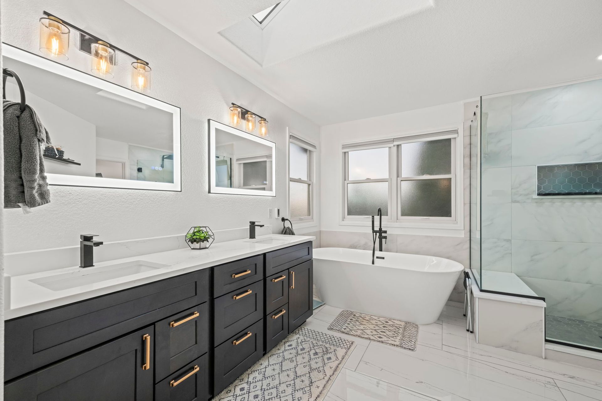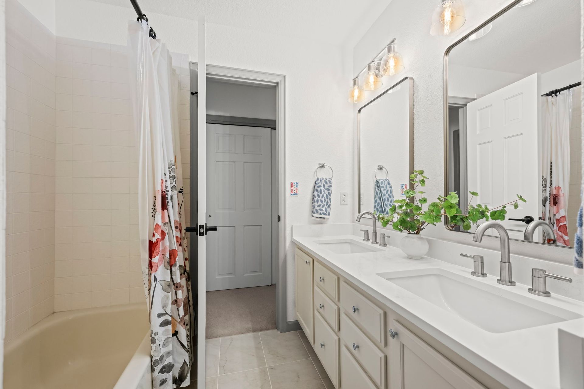 From the kitchen are multiple gathering areas that provide exceptional flow for both entertaining and daily living, including a formal living/dining room and a huge family room with 2-story ceilings & windows. Upstairs are 4 generous sized bedrooms: a spacious primary suite with a fully updated and spa-inspired 5-piece bath complete with heated floors & large soaking tub. 2 bedrooms share a newly updated Jack & Jill bath that, and a 4th bedroom up has an updated private ensuite bath.